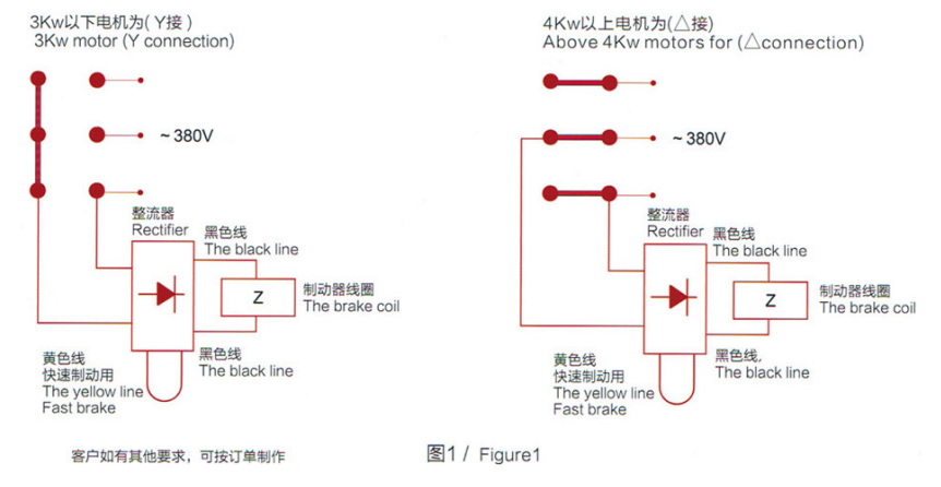 2. The DC brake can not be directly connected to the AC power to the brake coil is provided with suction cups for low-voltage winding rated DC voltage. A single-phase AC power is rectified then supply to a sucker winding to make it work, so the brake motor terminal box fitted with a rectifier, wiring diagram below.